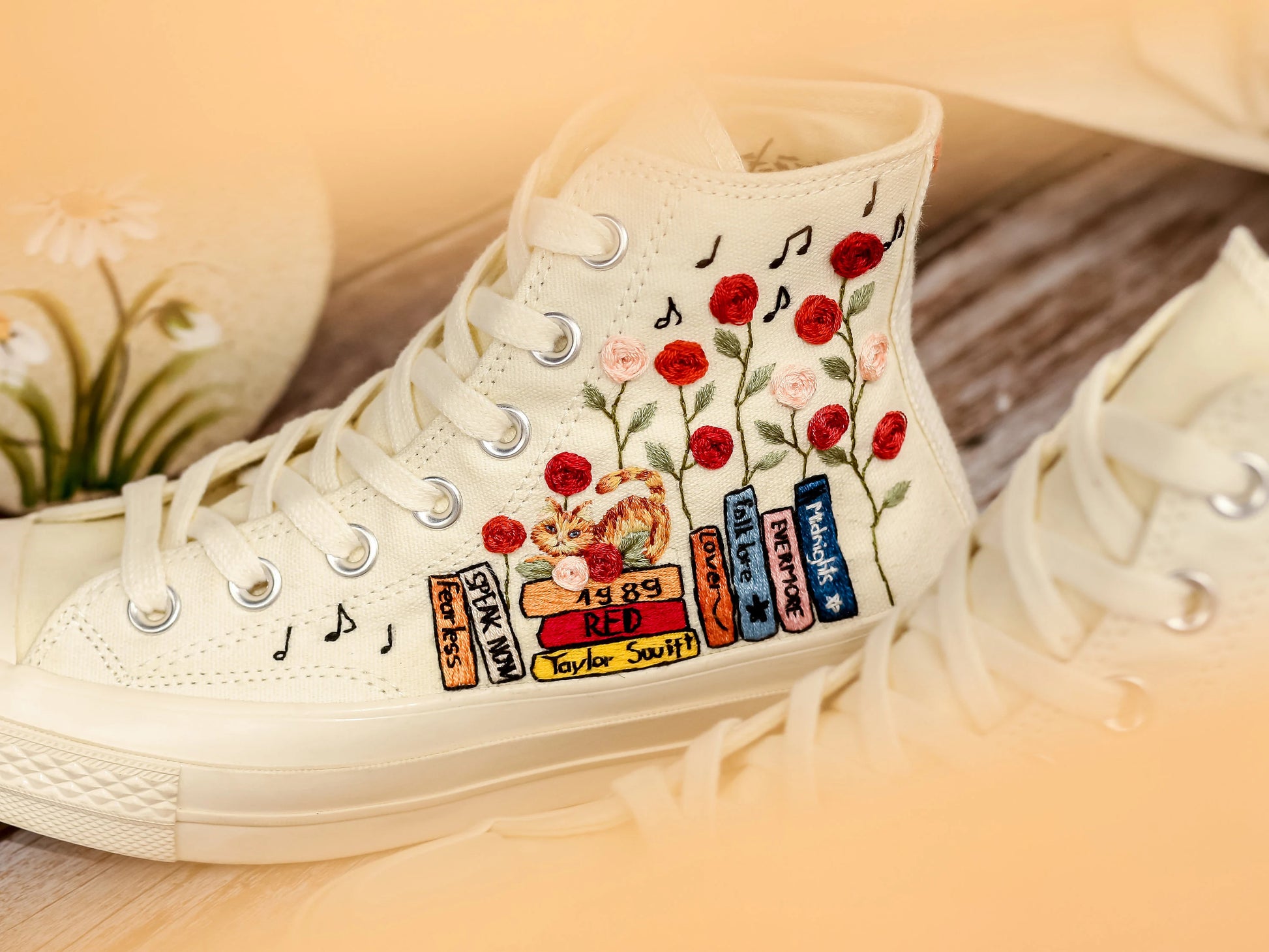 Step into style with these Custom Embroidered Converse High Tops, designed for those who love a blend of classic sneakers and delicate artistry. Each pair features beautifully hand-stitched lily blooms, adding a soft floral touch to the timeless Converse silhouette.
